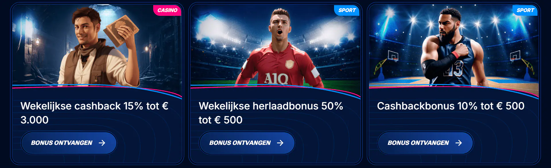 - Prijzen: cash beloningen, cashback, VIP bonussen.