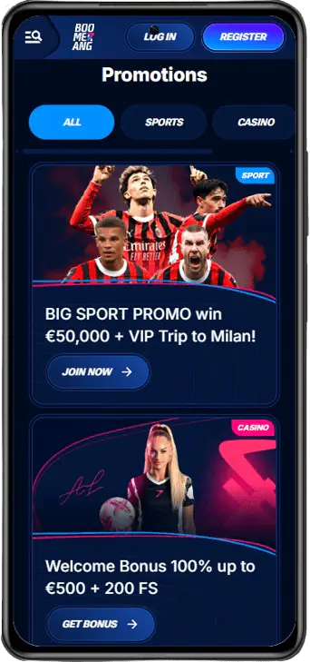 Kickstart je Boomerang bet reis met onze start bonus, gemaakt om de impact van je allereerste storting te verdubbelen. Stort eenvoudig uw nieuwe account met een minimum van 10 eur en u ontvangt een 100% matchbonus tot 250 eur. Alles wat je nodig hebt is je boomerang bet promo code.